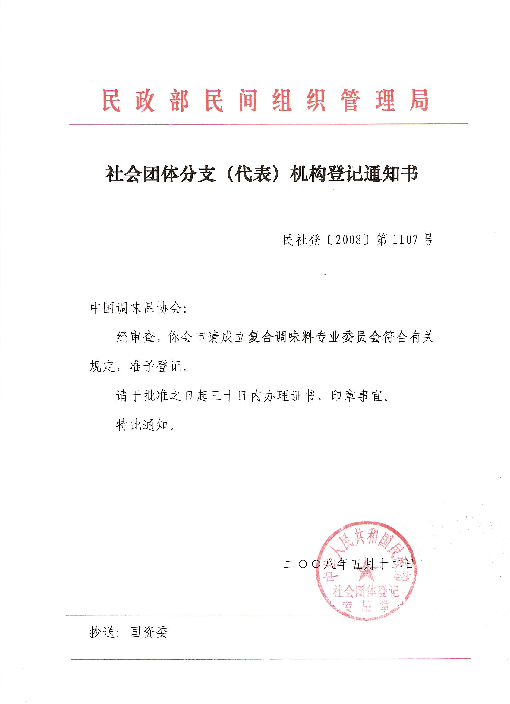 经中华人民共和国民政部(民社登[2008]第1107号文件)(见附件一)批准,皇冠体育最新网址(以下简称协会)复合调味料专业委员会正式成立。